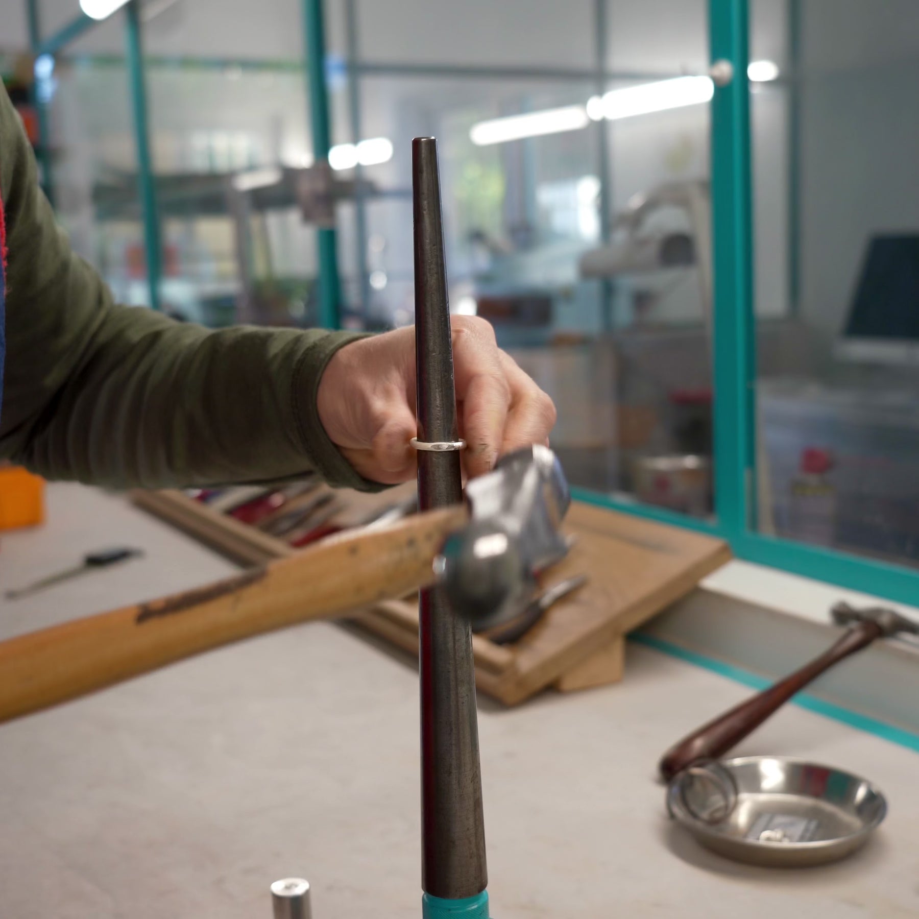 J’ai forgé cette bague en argent à l’aide d’un marteau spécial qui me permet de créer ces facettes nettes et immédiatement reconnaissables. Chaque coup compte : je cherche un rythme, une régularité, mais aussi de légères variations qui donnent du caractère à la pièce.