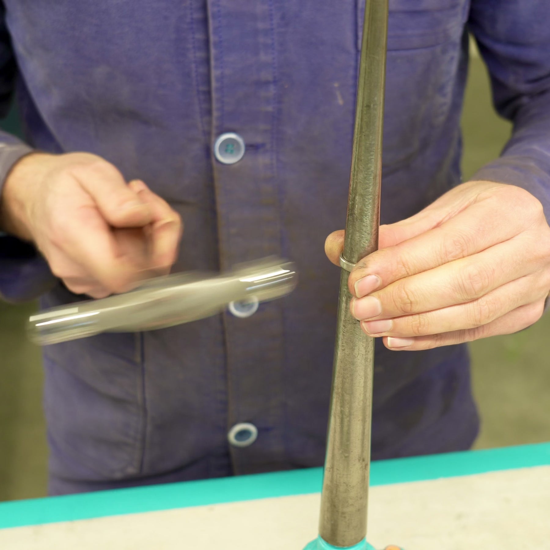 Je réalise cette bague en titane à partir d’un anneau simple, que je martèle pour lui donner une surface irrégulière et vivante.
