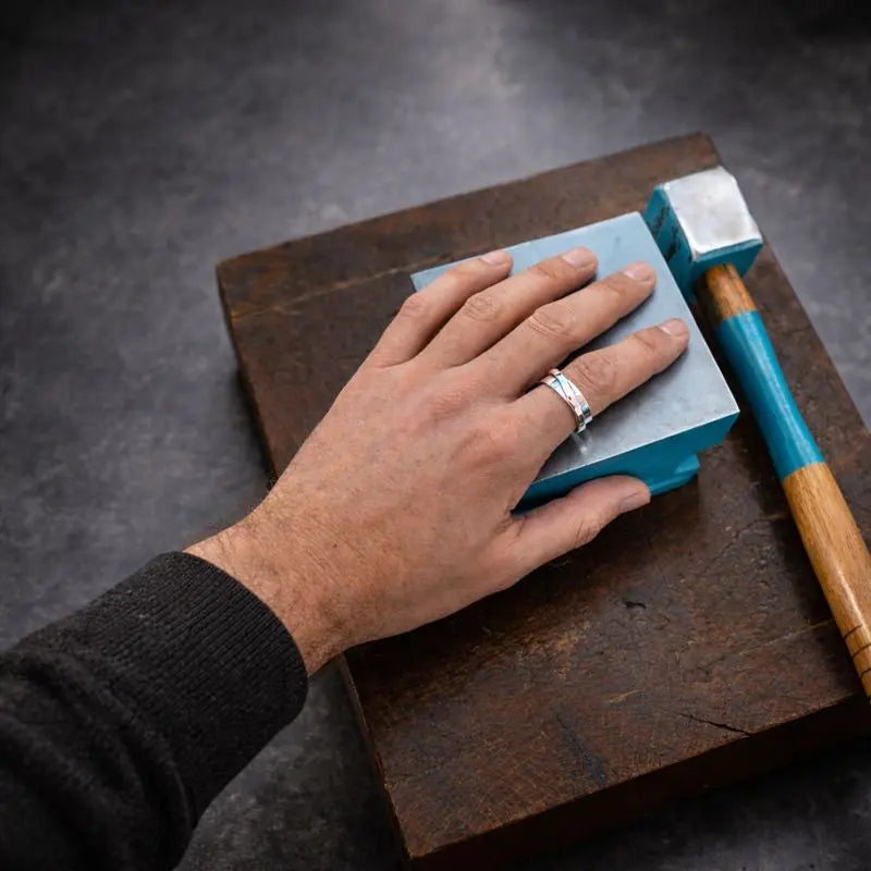 C’est une bague mixte, pensée pour celles et ceux qui aiment les formes sobres, franches, et le métal travaillé dans sa masse. Forgée à froid, l’argent devient dense et résistant. La bague garde une vraie tenue au doigt, tout en restant agréable à porter au quotidien.