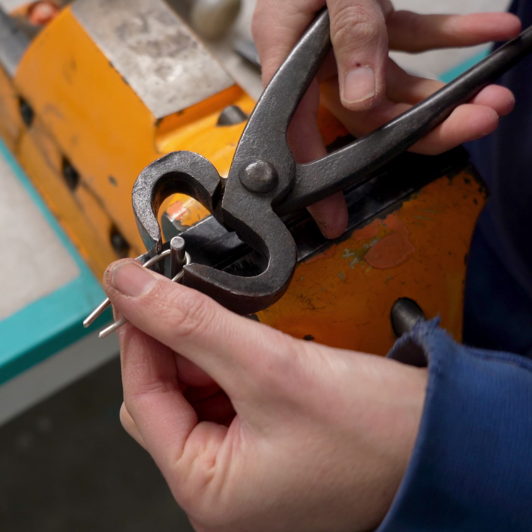 Chaque pièce que je crée est unique. Je pars d’un fil d’argent massif ou de titane que je forge à froid, à l’enclume, comme on le faisait autrefois. Aucun moulage, aucune série. Le métal durcit, prend sa forme sous le marteau, et garde la trace du geste.