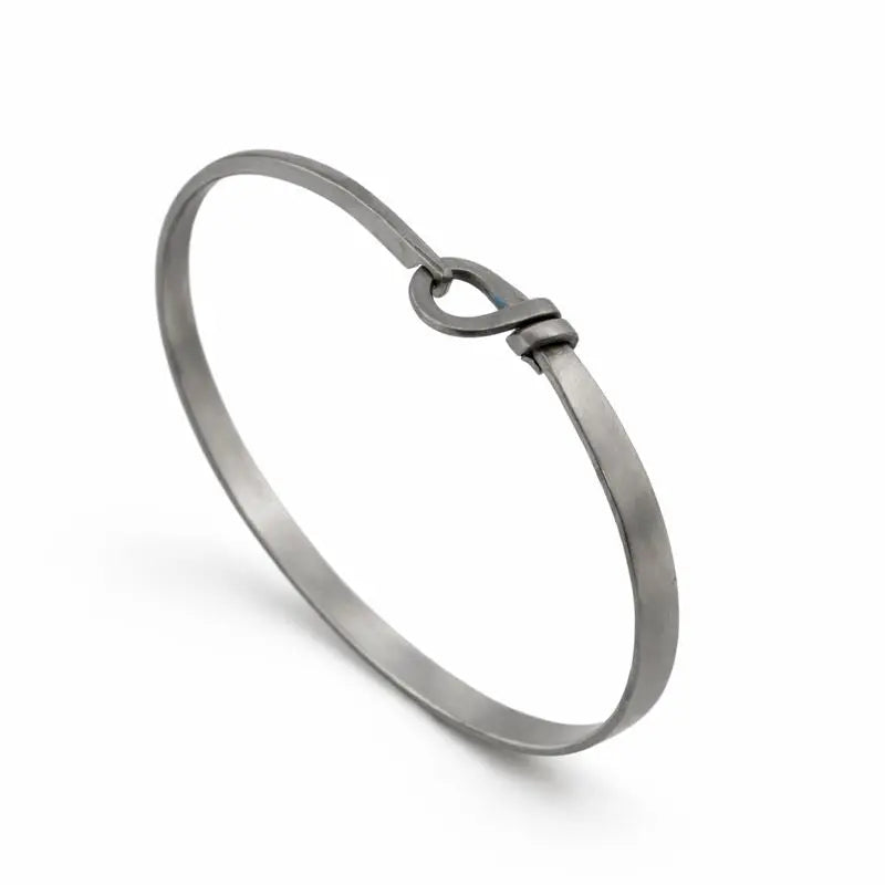 Il est réalisé en titane, à partir d’un fil que je forme et ajuste entièrement à la main. Le bracelet est rigide mais reste confortable grâce à l’élasticité naturelle du titane. Cette souplesse me permet de créer un fermoir intégré : un crochet qui vient se verrouiller par simple pression, sans pièce ajoutée.