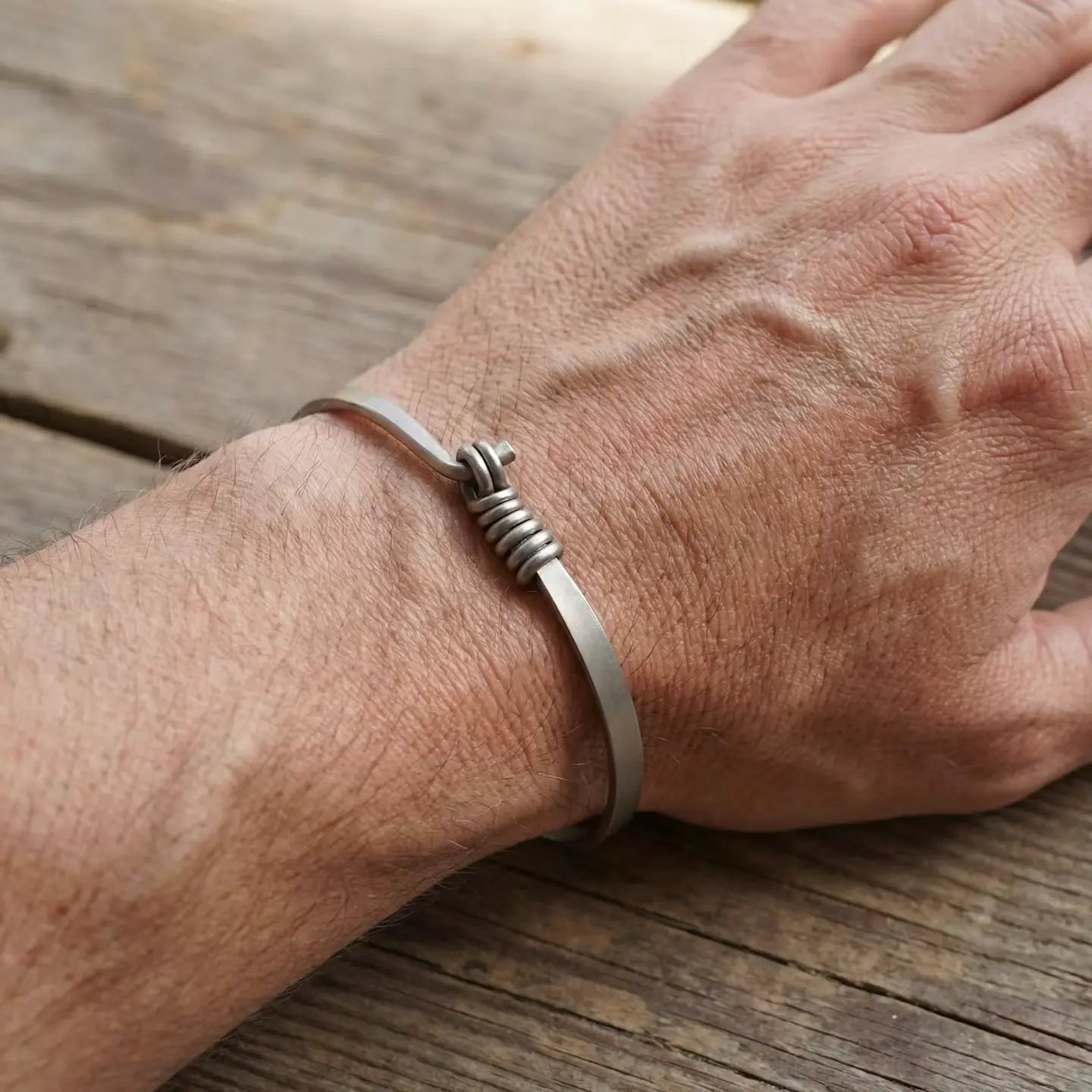 J’ai travaillé le métal pour obtenir une tension juste : le bracelet s’ouvre légèrement, puis se referme par pression. Les six vrilles ne sont pas un détail, elles participent directement au maintien. Elles créent un point d’accroche fiable, tout en apportant du relief à l’ensemble.