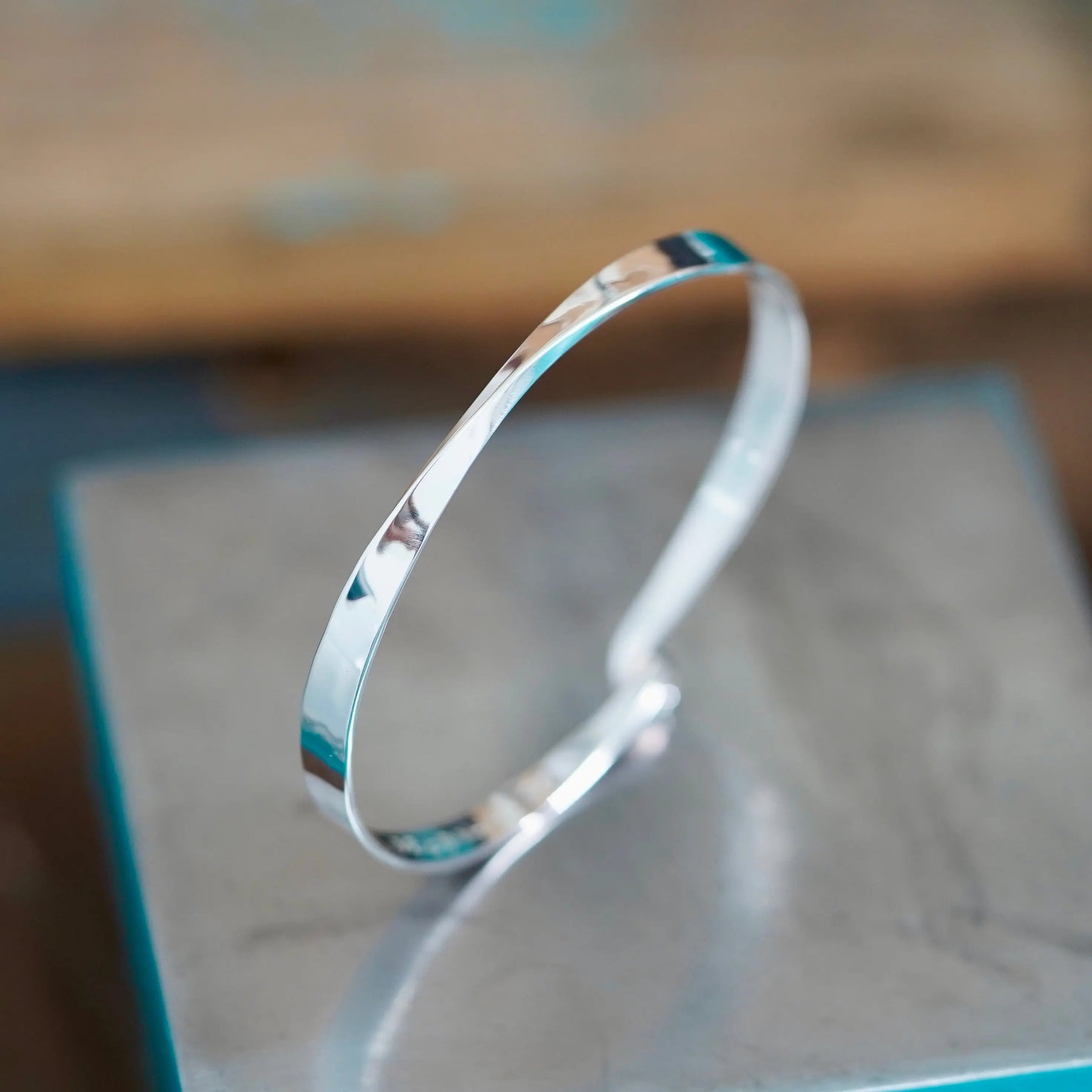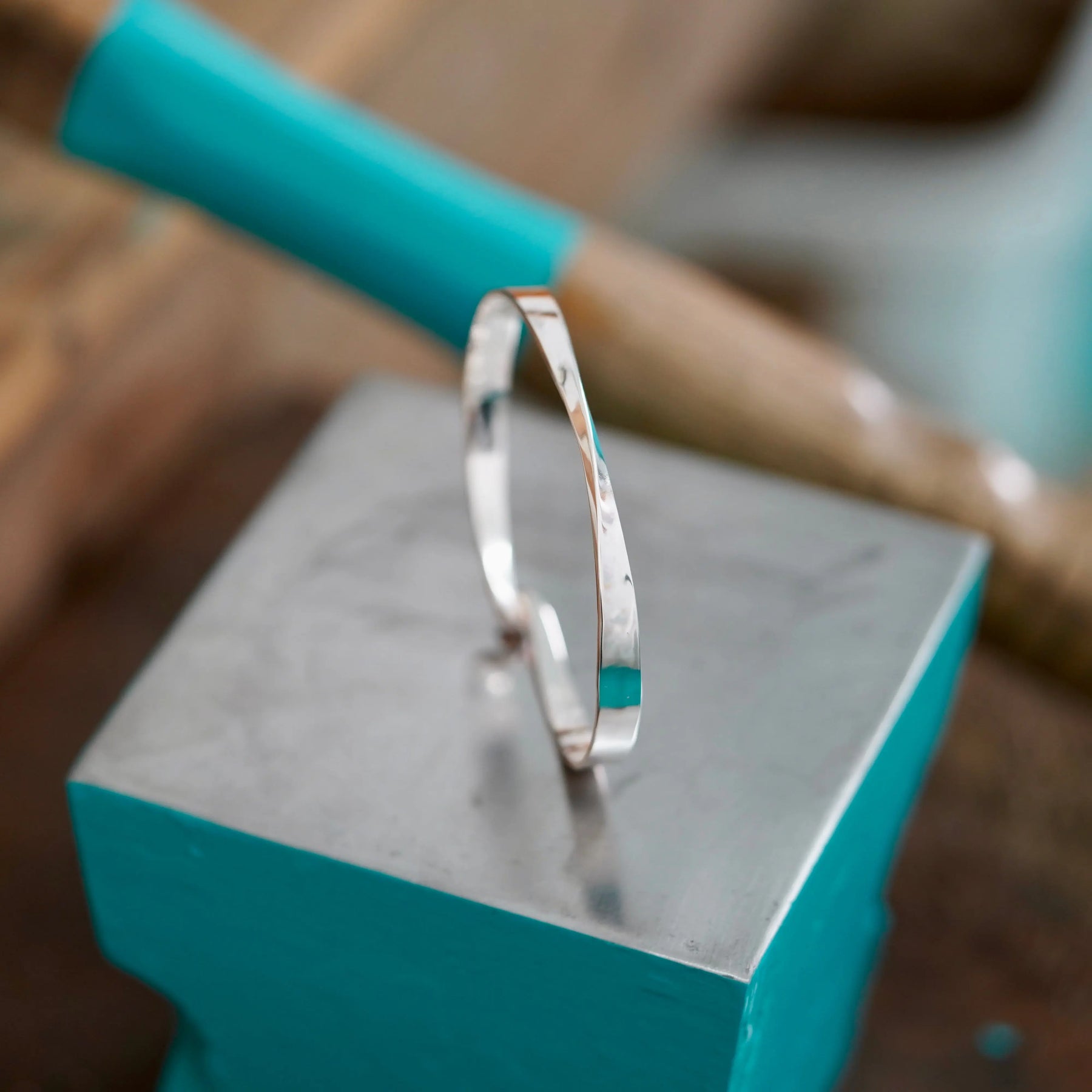 Ce bracelet en argent, forgé avec minutie, présente une caractéristique unique : son centre est travaillé de façon originale au marteau, créant une ligne qui s'enroule délicatement autour du poignet. La forge à froid a permis de sculpter cette torsion subtile, offrant un contraste captivant avec le reste de la pièce lisse. Il s'ouvre aisément, promettant une adaptation parfaite et un port quotidien confortable.