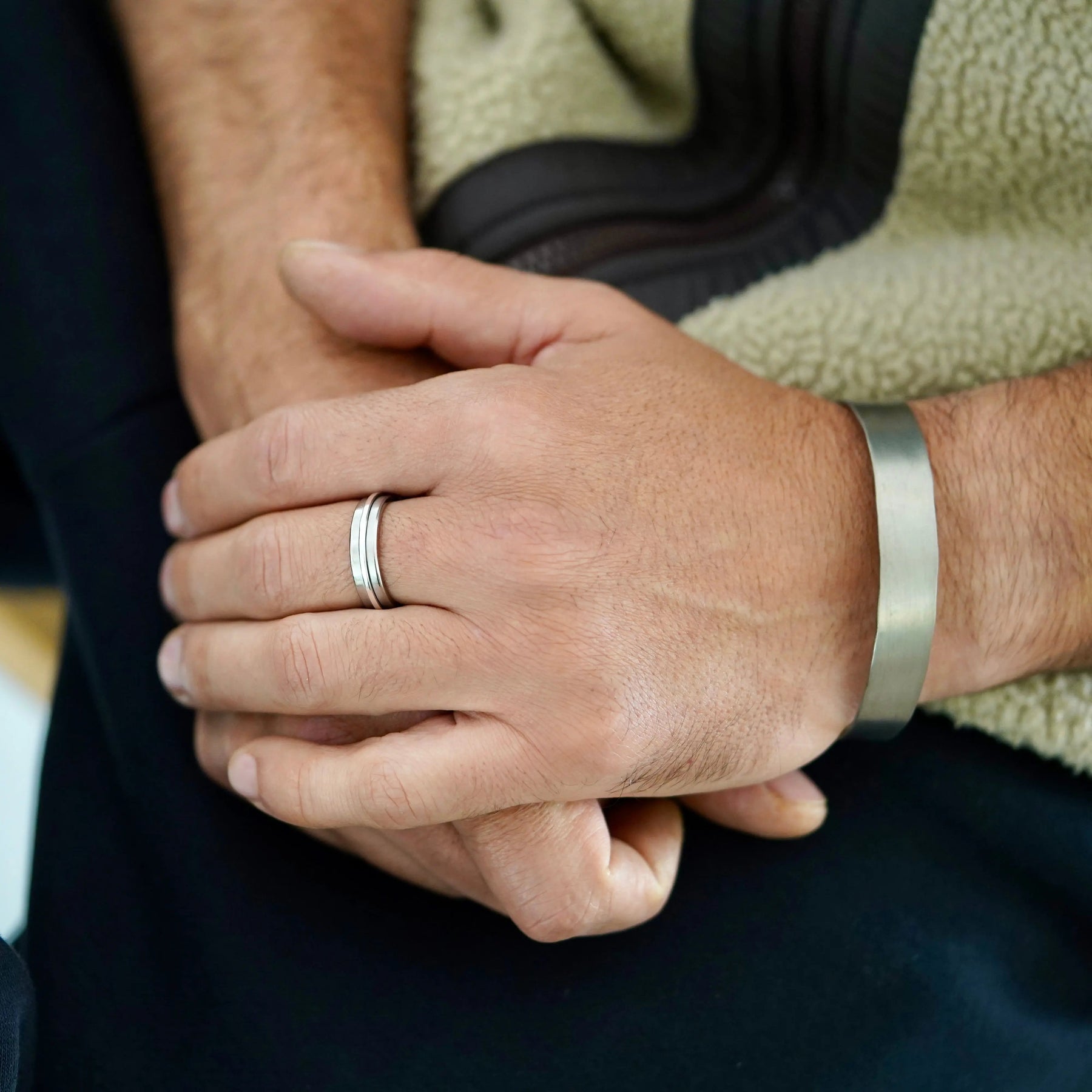 Je réalise la bague Oural à partir d’un anneau en titane massif, dans lequel je viens incruster un fil d’argent 925.