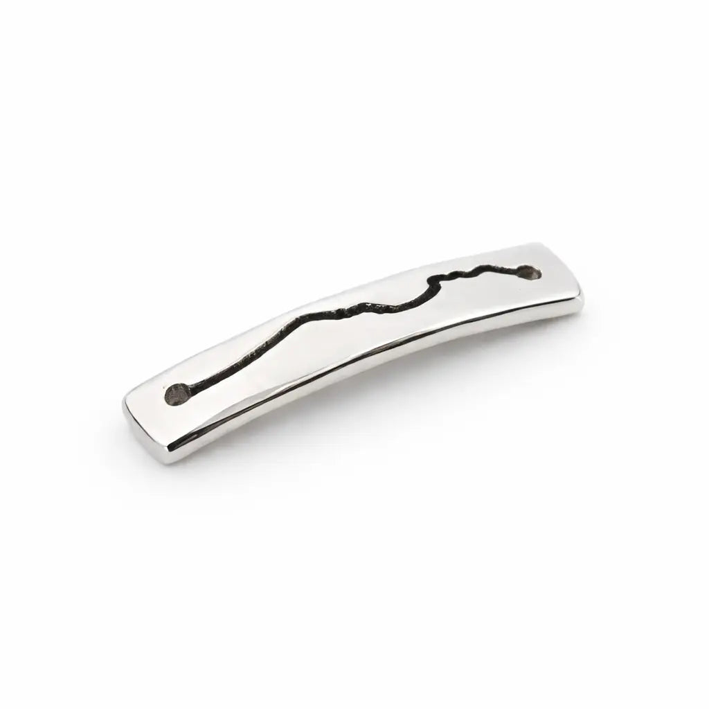 Cette pièce est façonnée à partir d’un simple fil d’argent massif. Je le forge à froid, coup après coup, jusqu’à obtenir cette courbe tendue, légèrement arquée, qui suit le mouvement naturel d’une crête. La ligne gravée vient souligner le paysage : une trace irrégulière, presque instinctive, comme si je la dessinais directement dans le métal.