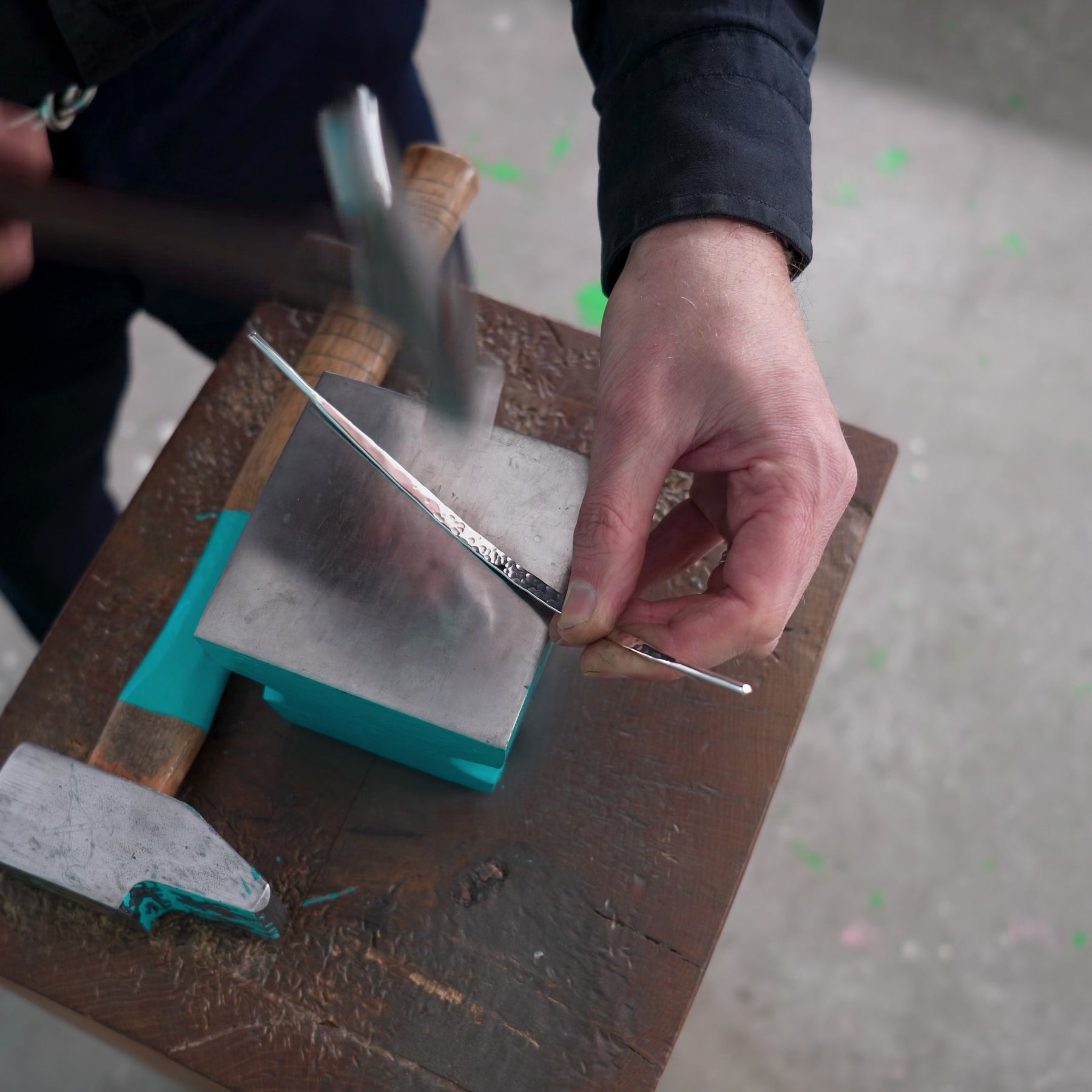 Chaque pièce que je crée est unique. Je pars d’un fil d’argent massif ou de titane que je forge à froid, à l’enclume, comme on le faisait autrefois. Aucun moulage, aucune série. Le métal durcit, prend sa forme sous le marteau, et garde la trace du geste.