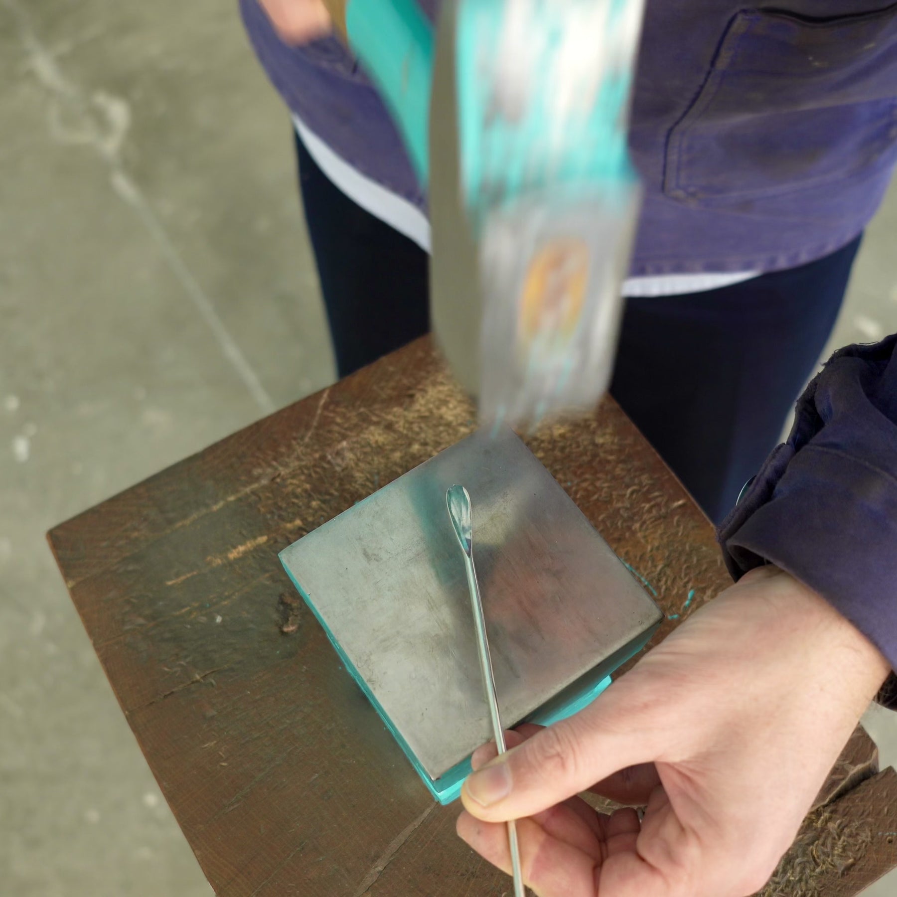 Chaque pièce que je crée est unique. Je pars d’un fil d’argent massif ou de titane que je forge à froid, à l’enclume, comme on le faisait autrefois. Aucun moulage, aucune série. Le métal durcit, prend sa forme sous le marteau, et garde la trace du geste.