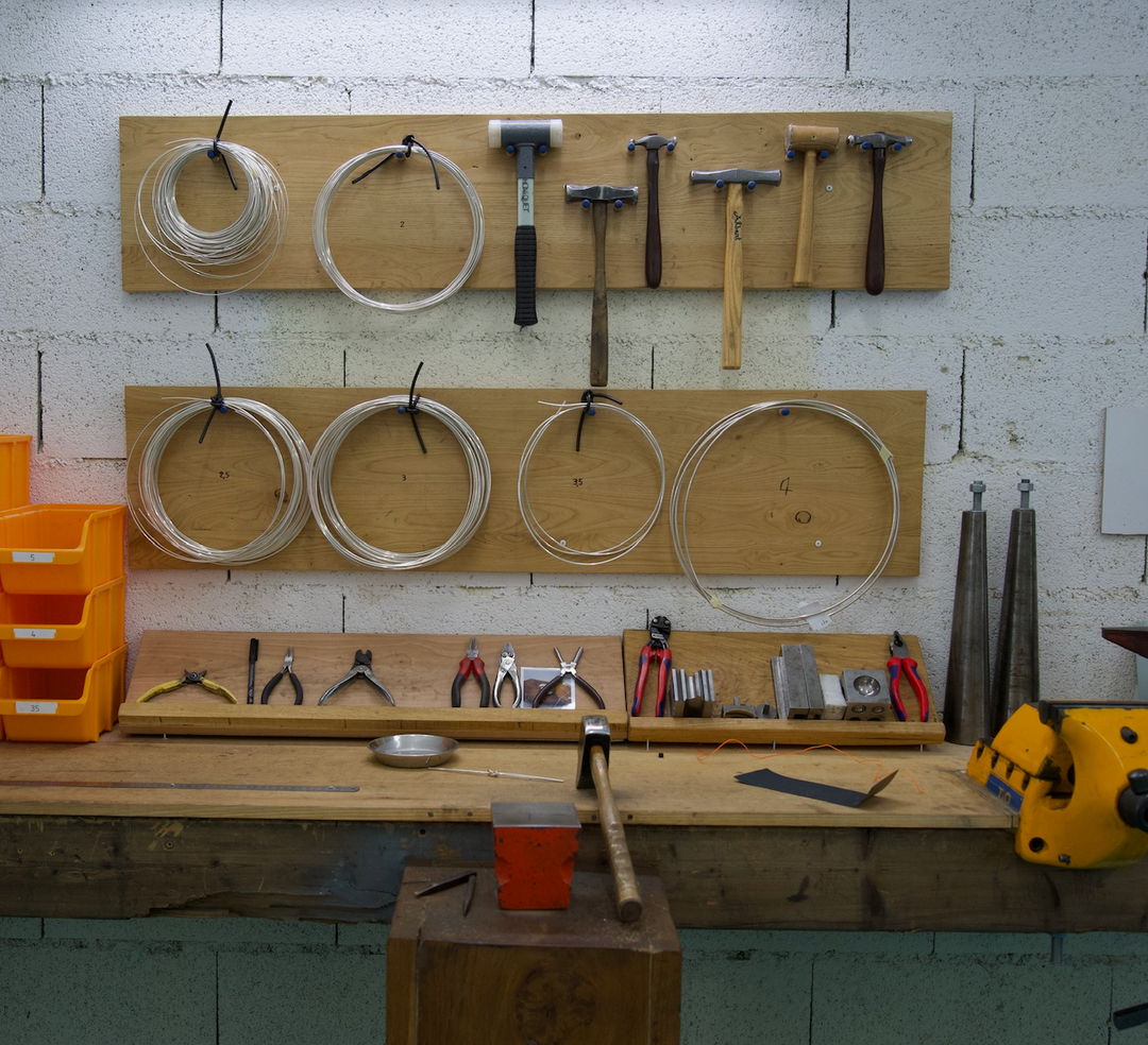 Le marteau, mon outil de prédilection, se décline en plusieurs formes pour s’adapter à chaque tâche spécifique. Du marteau lourd pour le forgeage à froid aux plus petits pour le travail délicat des bagues, chaque outil a son histoire, son but et son caractère.