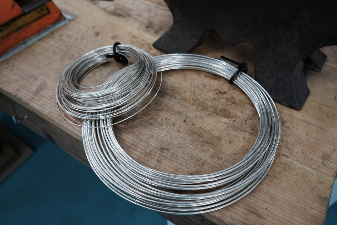 L’achat de la matière première est une étape cruciale dans mon processus créatif. Je sélectionne avec soin l’argent sous forme de fils ronds et parfois de plaques, privilégiant le fil recuit pour sa malléabilité.